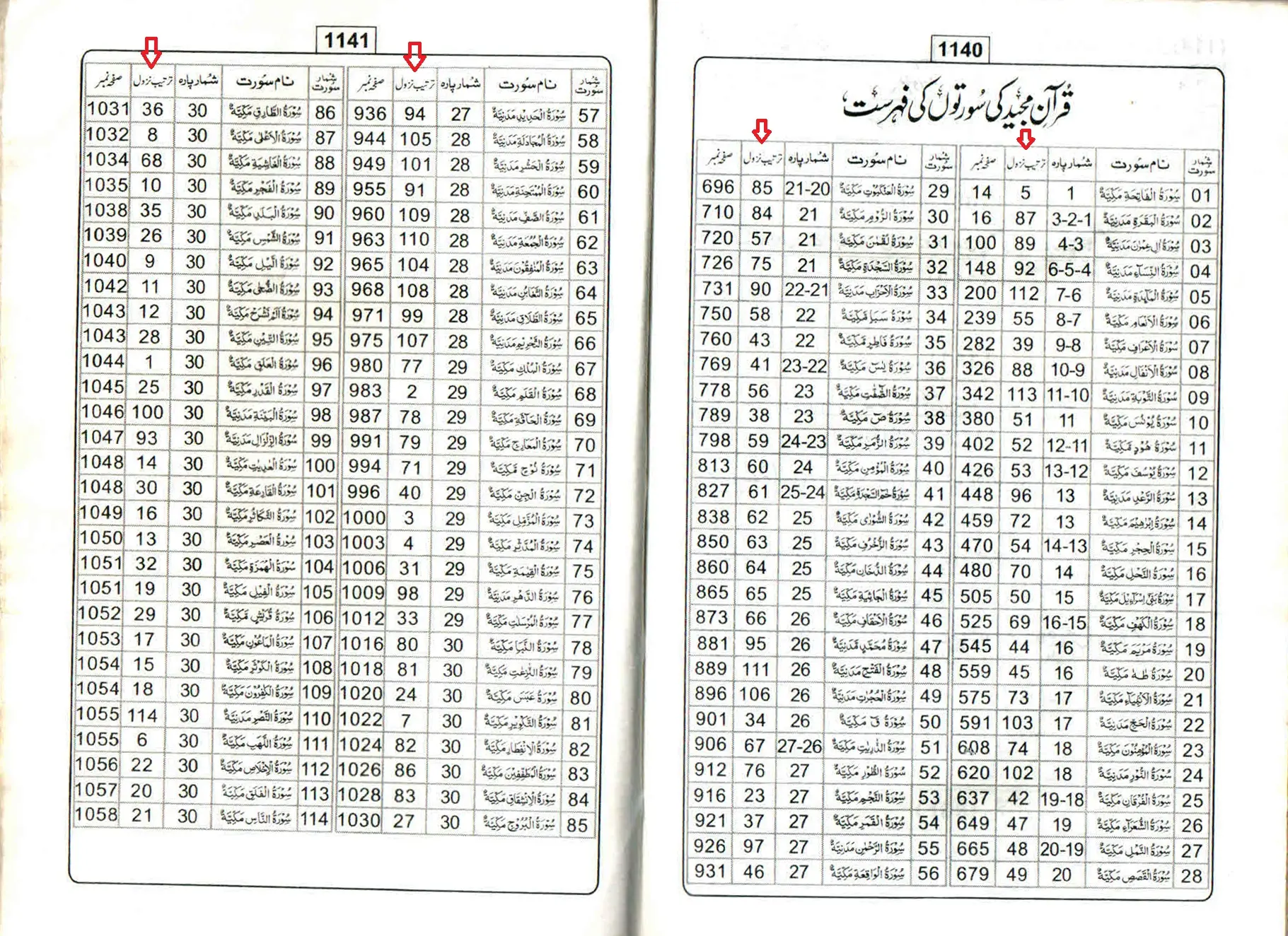 اس پسِ منظر کے بعد عرض ہے کہ قرآنی سورتوں کی نزولی ترتیب نیچے پیش کی گئی ہے۔ اس ترتیب میں پہلا نمبر نزولی ہے جبکہ سورت کے نام کے بعد بریکٹ میں دیا نمبر موجودہ نسخوں کی ترتیب کے مطابق ہے۔ موجودہ قرانی نسخوں میں بھی ہر سورت کے شروع میں نام کے بعد لکھا ہوتا ہے کہ یہ مکی سورت ہے یا مدنی۔ چنانچہ دوسری سورۃ البقرۃ مدنی سورت ہے اور اس کے مقابل آخری سپارے میں موجود سورۃ الفیل اور سورۃ لہب مکی سورتیں ہیں۔